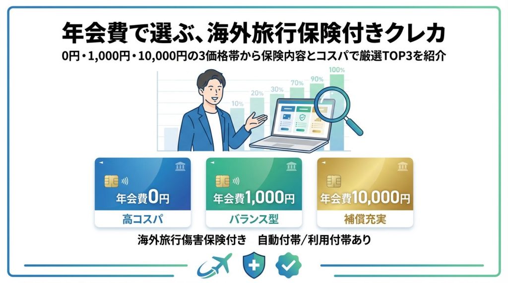 なお、一定以上の補償内容(治療費用や賠償責任など)を求める場合、年会費の安いカードで“自動付帯”のまま高水準の保険が付くケースは基本的にありません。そのため今回は、保険の実用性を優先し、「旅行代金などを所定の方法でカード決済することで補償が有効になる」利用付帯のカードに絞ってTOP3を選定しています。旅行前に「どの費用をカードで支払えば条件を満たせるか」さえを確認すれば、確実に補償は適用されます。